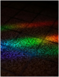 Colorful light spectrum creating a vibrant pattern on a textured tile floor, showcasing creative abstract art.