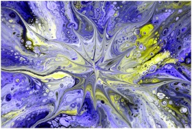 Dynamic abstract fluid art with swirling blue and yellow patterns, creating an eye-catching visual explosion.