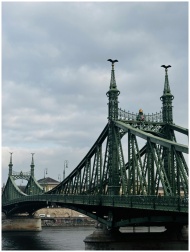 Scenic view of the historic Liberty Bridge in Budapest under cloudy skies.