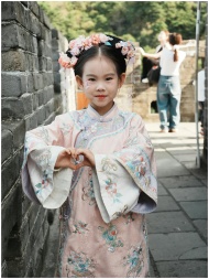 Young girl wearing traditional Hanfu poses at a historical landmark, making a heart shape with her hands.
