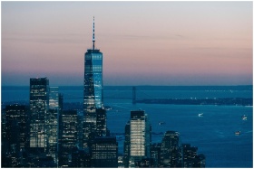 Beautiful view of New York City's skyline at dusk featuring the iconic One World Trade Center.