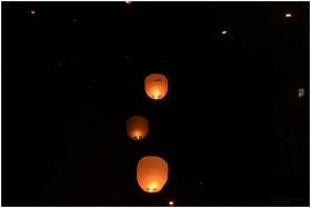 Sky lanterns glowing warmly as they ascend into th