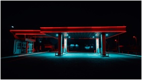 Urban gas station illuminated with vibrant neon li