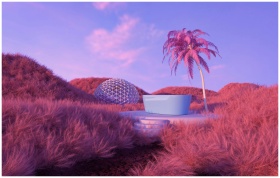 A surreal pink landscape featuring a futuristic tub and palm tree under a vibrant sky.