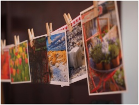 Colorful photographs and postcards clipped with wooden pins in a creative indoor arrangement.