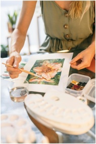 Close-up of an artist painting a flower with watercolors at a table indoors.