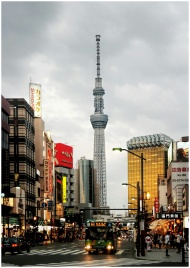 Vibrant Tokyo city street view with the iconic Skytree tower in the background.