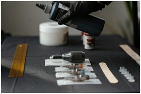 Close-up of tattoo equipment and ink in a tattoo s