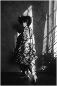 Stylish portrait of a woman in patterned dress casting shadows indoors.