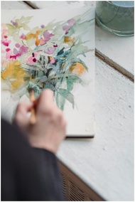 Detailed image of a hand painting a floral waterco