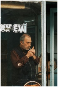 A man lights a cigarette inside a cozy, traditional tea house.