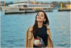 A woman in a tan coat smiles by the waterfront, holding a bouquet of flowers.