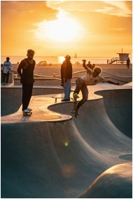 Dynamic skateboarders perform tricks at beach skate park during picturesque sunset.