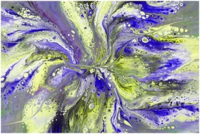 Vibrant fluid art featuring swirling patterns in purple and yellow tones.