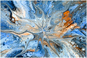 Dynamic abstract painting featuring swirling blue and orange colors, capturing movement and energy.