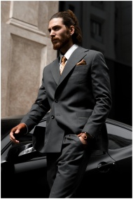 Sophisticated businessman in suit walking past a luxury sportscar in a city setting.