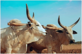 Two oxen standing in a field with a clear blue sky, depicting a serene rural scene.