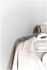 A selection of neutral-colored clothes hang neatly
