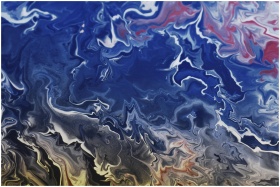 Vivid abstract painting with swirling blue, navy, and red acrylic tones creating a dynamic, fluid design.