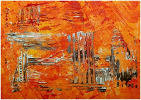 Dynamic abstract painting in vivid orange tones with layered textures and movement.