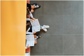 Children reading books on a school bench, viewed from above. Ideal for educational themes.