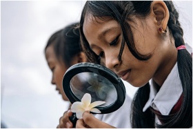 Curious schoolgirls examine a flower closely through a magnifying glass, sparking a love for science and discovery.