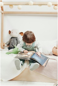 Adorable child reading a book in a cozy playroom, surrounded by toys. Perfect for early learning themes.
