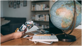 An inviting scene of exploring travel memories with Polaroid photos, globe, and notes.