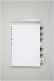 Simple flat lay of a spiral notebook with decorative tabs and a pen on a plain white background.