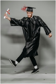 Happy graduate in cap and gown joyfully dancing wi