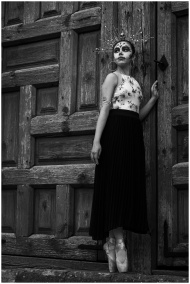 A graceful woman poses in traditional Catrina atti
