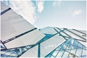 A modern glass facade reflecting a cloudy sky, sho