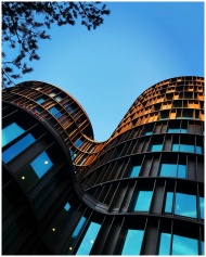 Stunning low-angle shot of a modern curved glass architecture in Copenhagen, Denmark.