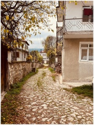 Rustic cobblestone street in a charming village with cozy houses, evoking a peaceful autumn vibe.