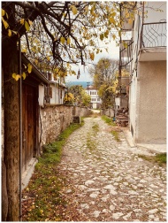 Picturesque cobblestone alley with autumn leaves c