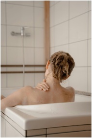 Woman enjoying a soothing bath moment, highlighting relaxation and personal care.