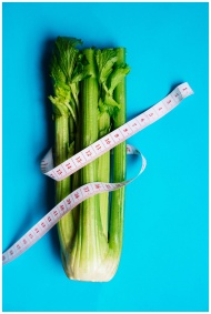 Vertical shot of fresh celery stalks wrapped in a measuring tape on a vibrant blue background.