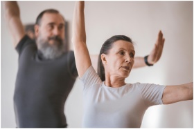 Senior adults in a yoga session indoors, focusing on stretching and balance.