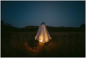 A ghostly figure illuminated in a dark field captures the Halloween spirit.