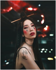 Captivating portrait of a tattooed woman with dramatic makeup and unique hairstyle at night in New York.