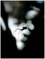 Eerie silhouette of a spider on its web, adding a creepy, dark mood.