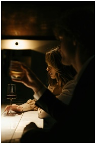 Couple enjoying drinks at a cozy bar, creating an intimate atmosphere.