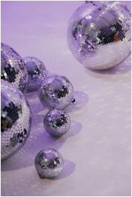 A collection of disco balls casting reflections on a purple lit floor, creating a vibrant atmosphere.