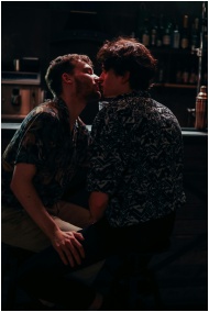 A loving couple shares a romantic kiss in a dimly lit bar, expressing affection.