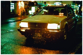 A yellow taxi driving through rainy streets at night in Tokyo, Japan.