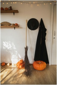 Festive Halloween setup with pumpkins, witch's hat, and broom indoors.