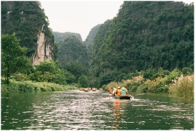 Group of kayakers paddling through a lush green valley surrounded by towering cliffs.