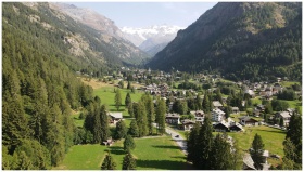 Aerial view of a picturesque alpine valley with a charming village nestled among lush greenery and towering mountains.