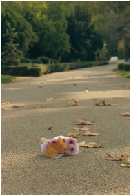 Fallen autumn leaves and a small bouquet on an empty road create a serene outdoor scene.