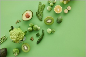 Top-down view of assorted fresh green vegetables and fruits on a vibrant green background.